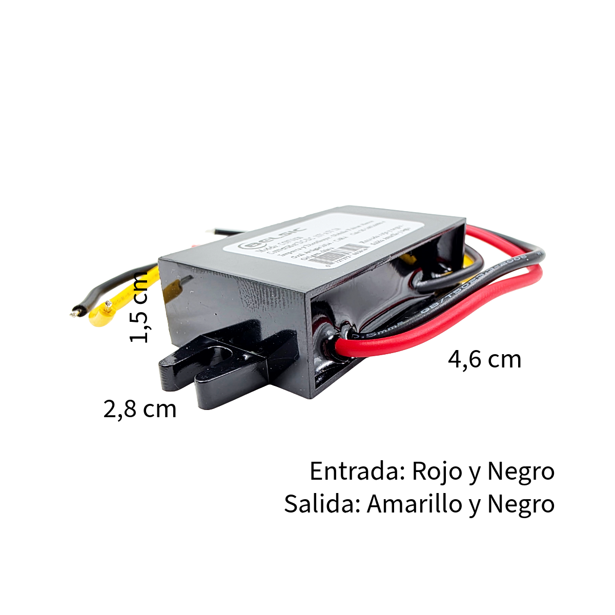 Conversión de voltaje: Este convertidor permite reducir la tensión de entrada de 12V a un voltaje de salida de 5V, adecuado para alimentar dispositivos que requieren ese nivel de tensión.